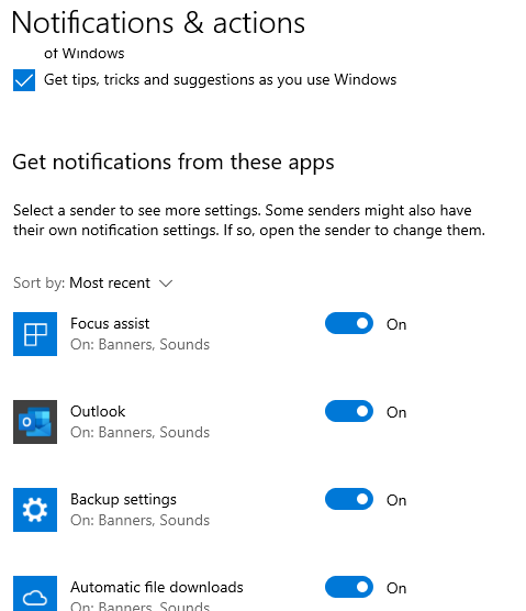 - Manage Notifications in your Windows 10 Settings: Choose which pop ups you want or don’t want to see. If you have them all selected, each time an update is available, a new email arrives, there are changes to any files in OneDrive, you will receive a notification. This can be annoying, so be sure to turn them off and on as needed. Instead, why not check your email once an hour, you can set up an alarm to remind you.